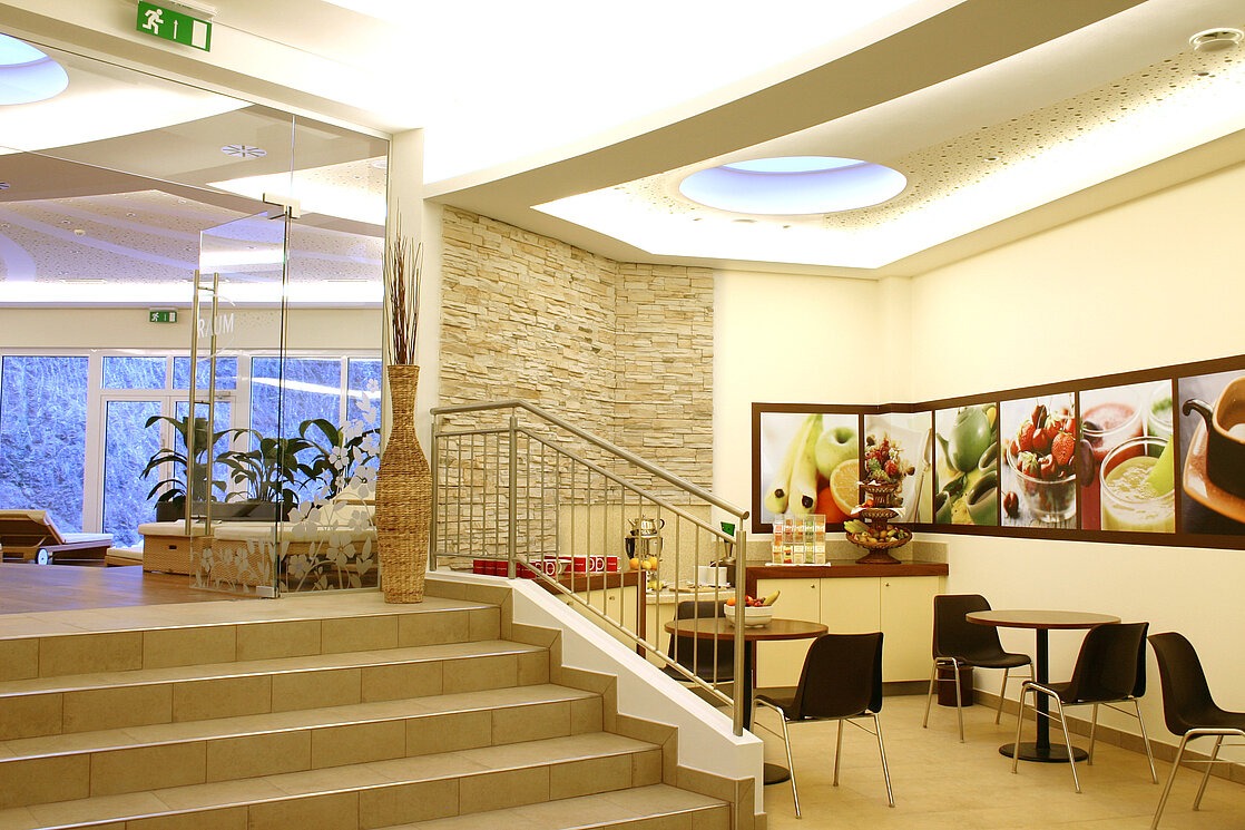Exklusiv für unsere Hotelgäste vervollständigt eine eigene Teebar mit Obst und Fruchtsäften im Wellnessbereich das Saunaerlebnis. Frisches Quell- und Sodawasser beleben Körper und Geist nach dem Saunagang. In gemütlicher Runde entspannen Sie bei vitalisierenden Getränken und Vitaminen aus dem Obstkorb.