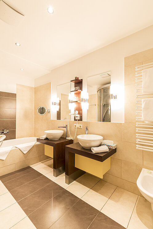 Die neue Suite Vindobona mit direktem Schneebergblick verfügt über ein großzügiges Bad mit Badewanne und Dusche.