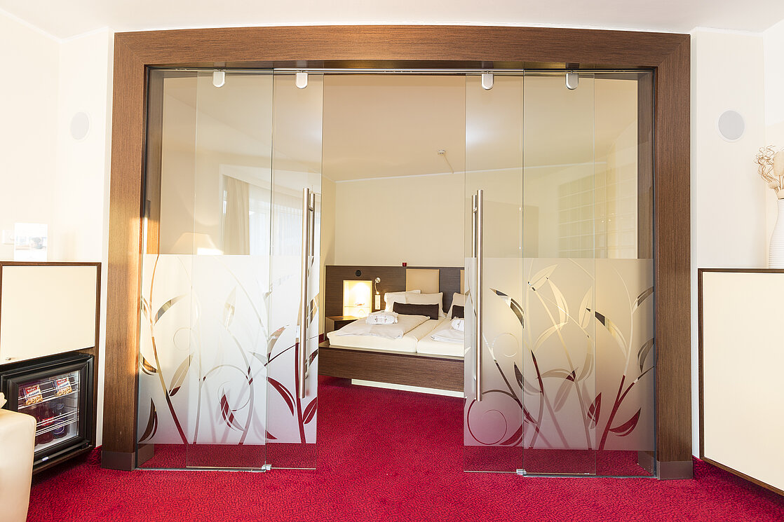 Die Junior-Suite besteht aus einem Schlafbereich und einem Wohnbereich, getrennt durch eine Glasschiebetür. Internetanschluss und zwei Flachbildfernseher sowie ein DVD-Player gehören ebenso zur Ausstattung wie ein großzügiges Bad mit Badewanne und Dampfdusche.
